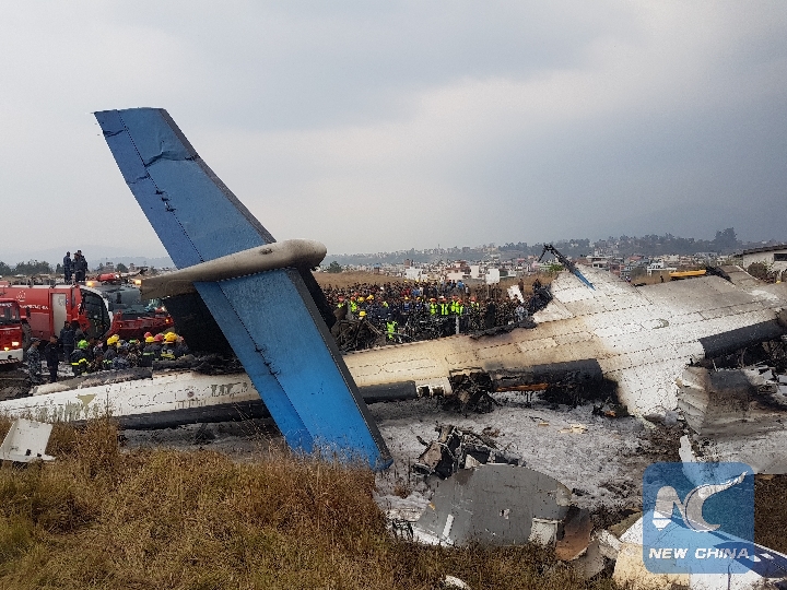Rescuers work at the plane crash site in Kathmandu, Nepal, on March 12, 2018. At least 49 people were killed after a passenger plane crashed at Nepal's Tribhuvan International Airport (TIA) on March 12. (Xinhua)
