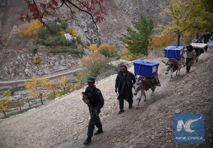Workers of Afghan Independent Election Commission (IEC) transport election materials in Abdullah Khil valley of Dara district of Panjshir province, eastern Afghanistan, on Oct. 19, 2018. (Xinhua/Rahmat Alizadah)