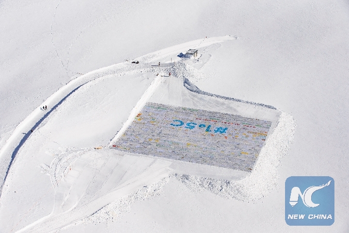 A gigantic postcard is seen on the Aletsch glacier under Jungfraujoch in Switzerland, on Nov. 16, 2018. The gigantic postcard breaking the Guinness World Records was staged just under the Swiss Jungfraujoch to raise awareness worldwide of the emergency and necessity to fight climate change. (Xinhua/Xu Jinquan)
