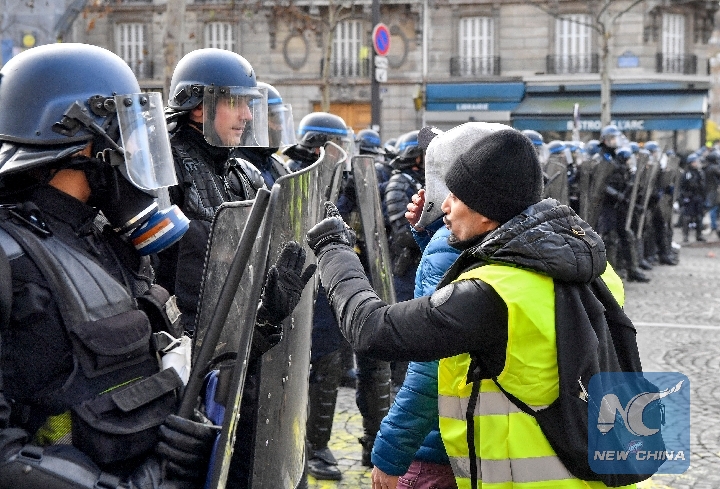 A "Yellow Vest" protester confronts police near the Arch of Triumph in Paris, France, on Dec. 8, 2018. (Xinhua/Chen Yichen)