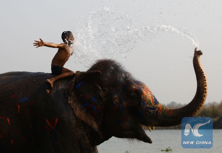 A boy enjoys elephant bathing during the 15th Elephant Festival in Sauraha, a tourism hub in southwest Nepal's Chitwan district, on Dec. 27, 2018. (Xinhua/Sunil Sharma)