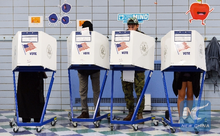 Voters fill in their ballots for the midterm elections at a polling station in Manhattan of New York, the United States, on Nov. 6, 2018. (Xinhua/Li Rui)