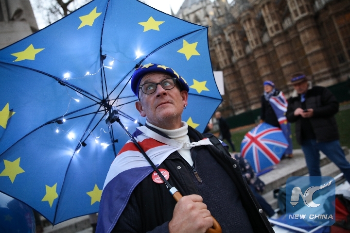 A protester opposed to the Brexit deal demonstrates outside the Houses of Parliament in London, Britain, on Dec. 10, 2018. (Xinhua/Joe Newman)