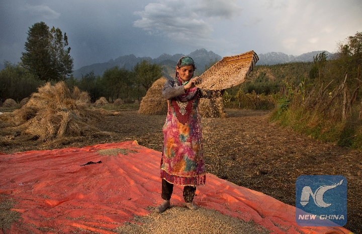 A Kashmiri woman winnows food grains at a village in Anantnag district about 72km south of Srinagar city, the summer capital of Indian-controlled Kashmir, Sept. 30, 2018. (Xinhua/Javed Dar)