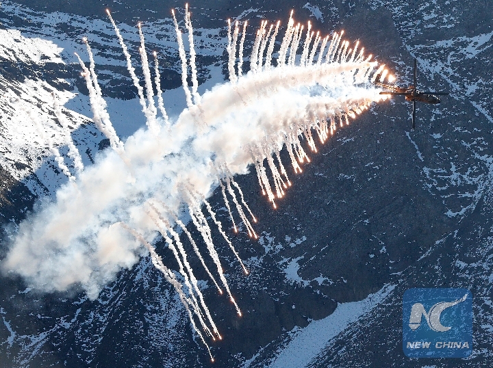 A Swiss Cougar Super Puma helicopter performs during an air show of the Swiss Air Force on the Axalp near Meiringen Air Base, Switzerland, on Oct. 10, 2018. (Xinhua/Ruben Sprich)