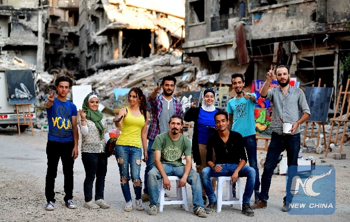 Syrian artists flash the victory sign amid the rubble and destruction of the Yarmouk Camp, south of Damascus, Syria, on Aug. 16, 2018 (Xinhua/Ammar Safarjalani)