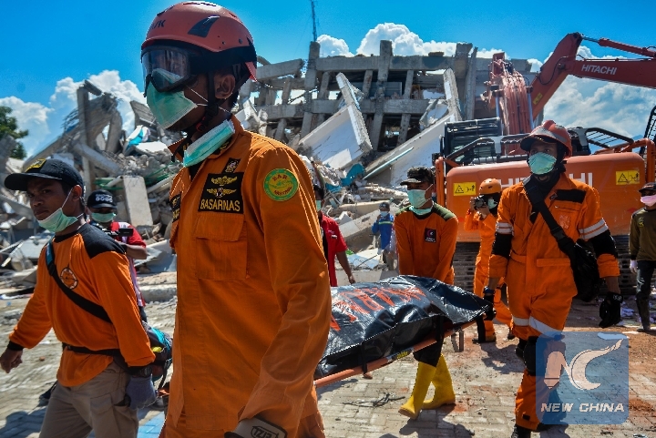 Rescuers transfer the body of an earthquake victim at a collapsed hotel in Palu, Central Sulawesi, Indonesia, on Oct. 1, 2018.(Xinhua/Iqbal Lubis)