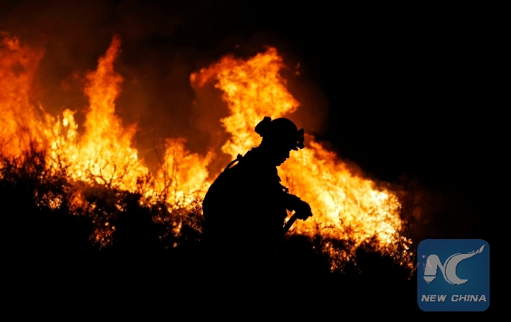 A firefighter works as the wildfire burns in the Cleveland National Forest in Lake Elsinore, California, the United States, Aug. 9, 2018. (Xinhua/Li Ying)