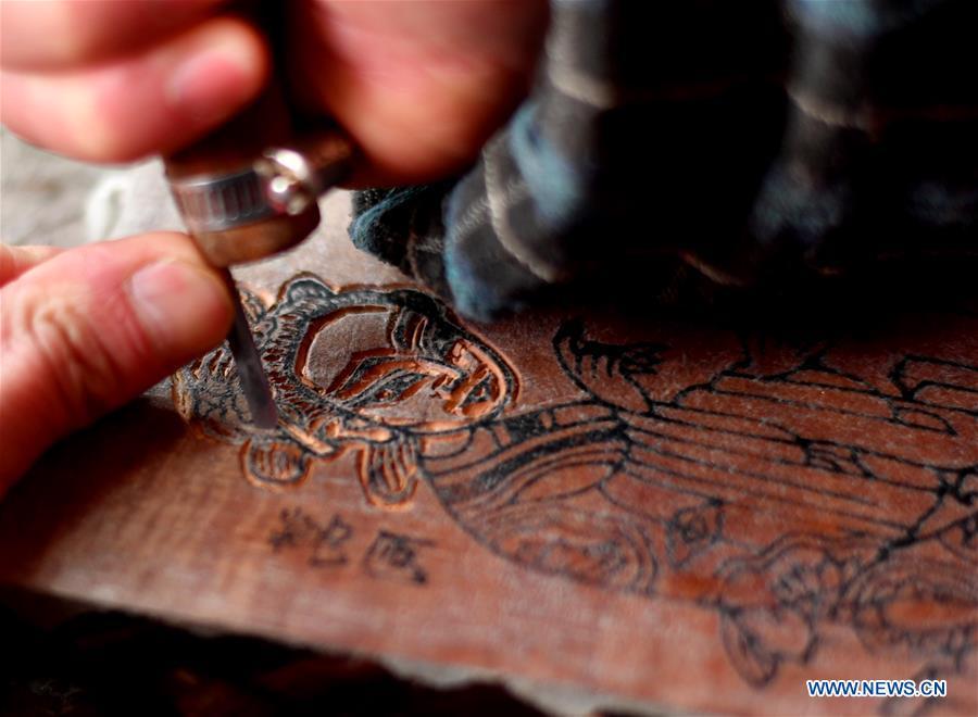 A folk artist carves a woodblock for New Year prints in Zhuxian Township of Kaifeng City, central China's Henan Province, Jan. 8, 2019. Zhuxian Township, well known for its traditional New Year-themed woodblock printing art, has seen the busy production of New Year pictures for the upcoming Chinese Spring Festival, which falls on Feb. 5 this year. (Xinhua/Li Jianan)