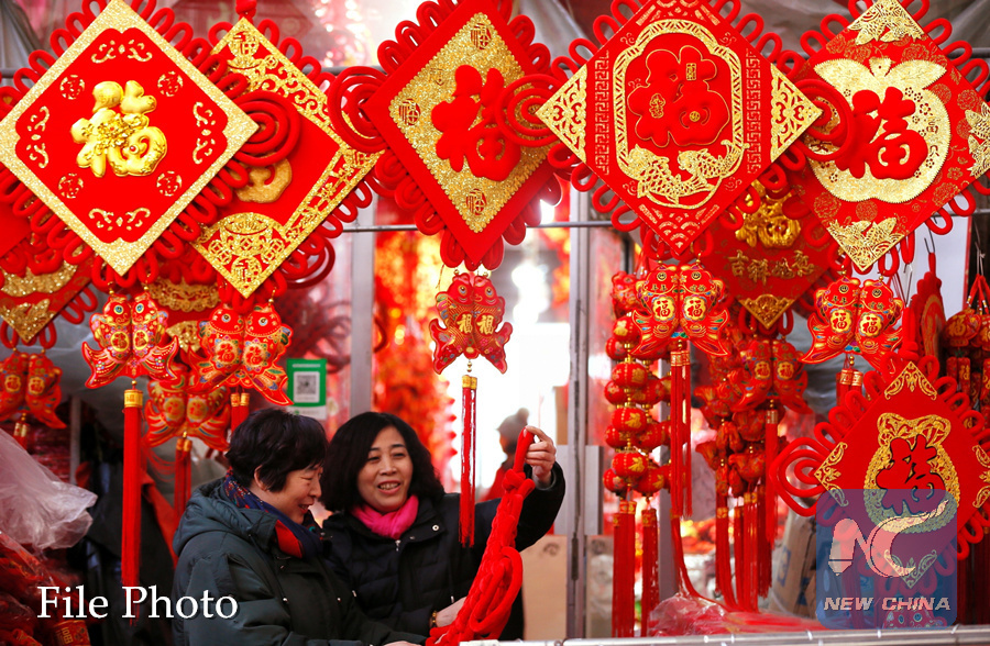 Consumers select NewYear decorations at a market in Jimo District of Qingdao, east China's Shandong Province, Jan. 8, 2019. (Xinhua/Liang Xiaopeng)