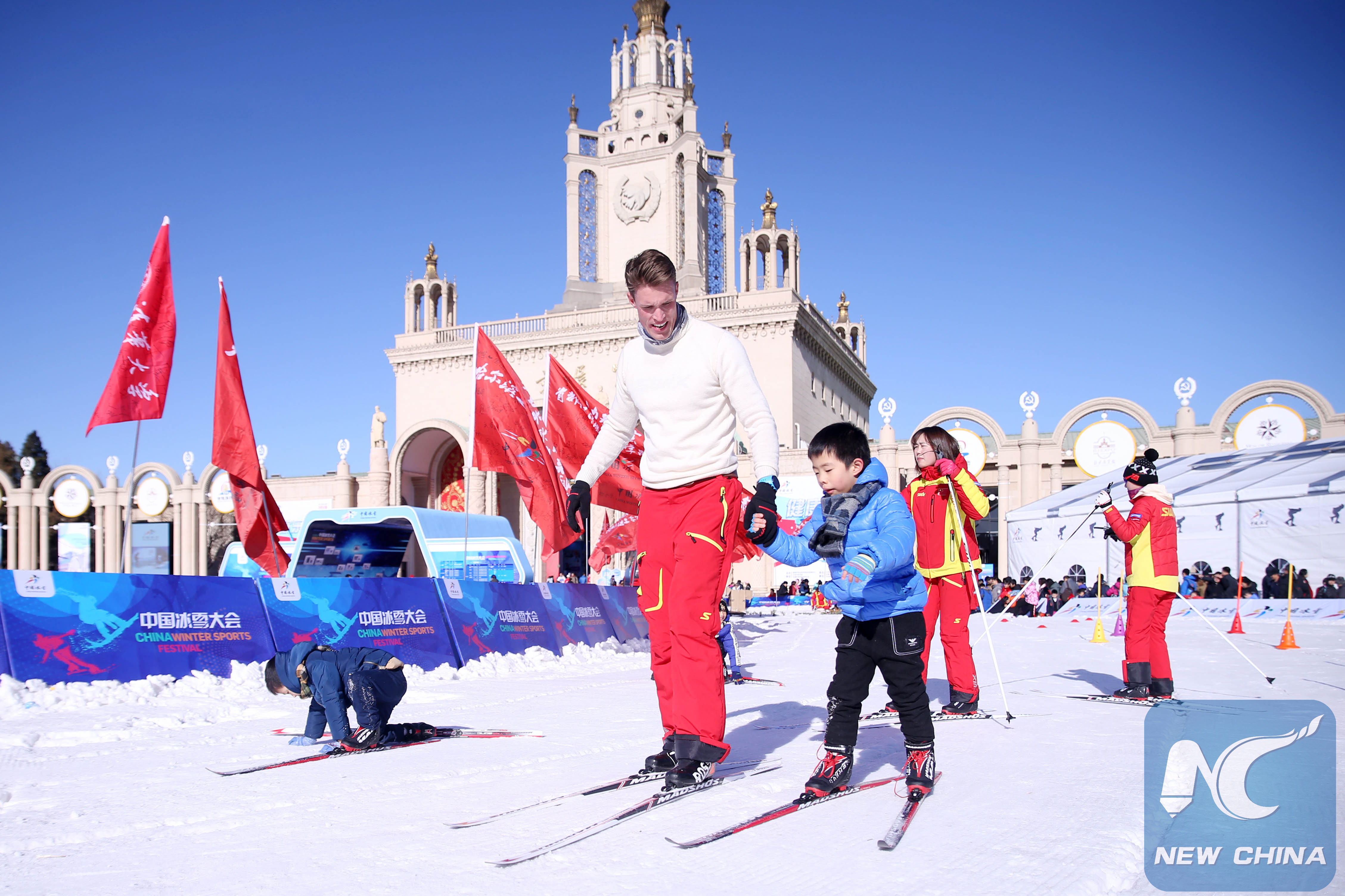 Photo taken on Dec. 23, 2018 shows athlete from Norway teaching children to ski during an ice and snow fair in Beijing. (Xinhua/Chen Xiaogen)