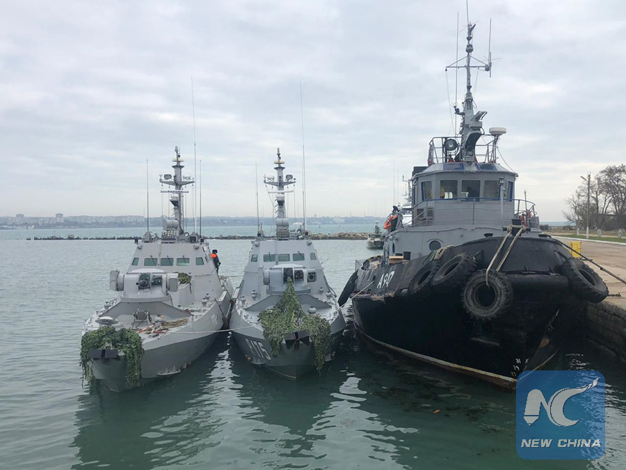 Photo taken on Nov. 26, 2018 shows three Ukrainian naval ships seized by Russia. (Xinhua/Sputnik)