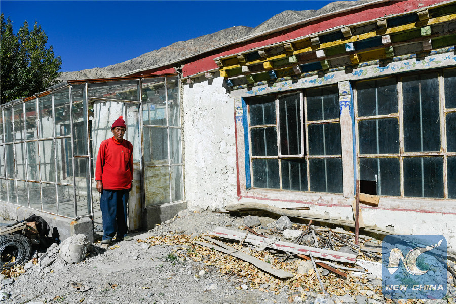 Ngoizhub Gyaco next to his family's third home, Oct. 30, 2018. (Xinhua/Liu Dongjun)