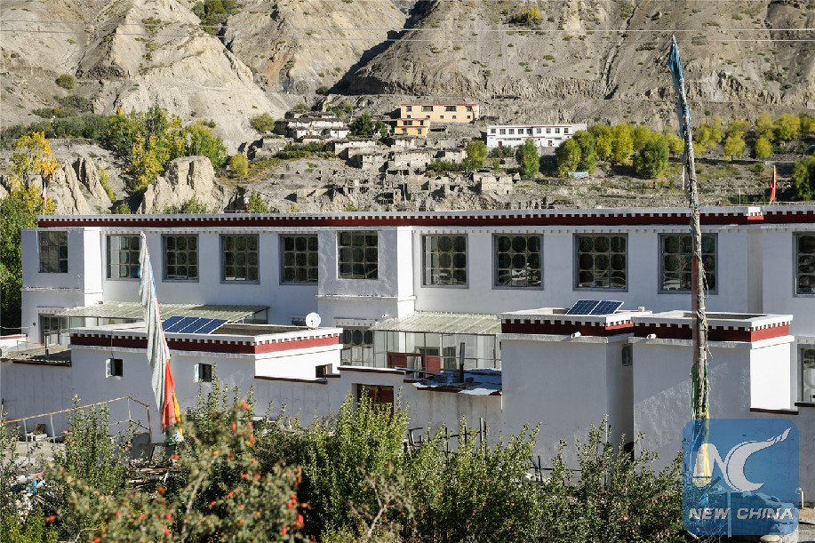 Photo taken on Oct. 30, 2018 shows the four generations of houses in Qusum village, southwest China's Tibet Autonomous Region. The first generation mud sheds, at the bottom of the picture, are mostly in ruins. The newest homes, built in 2016, can be seen in the top right. (Xinhua/Dainzin Nyima Choktrul)
