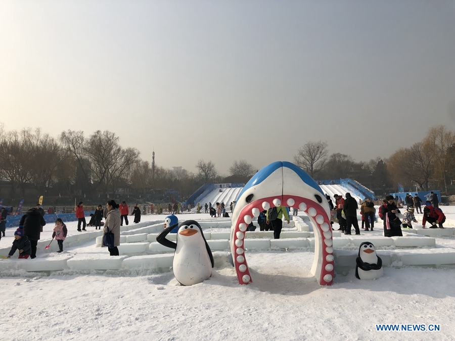 People have fun in outdoor snow area at Taoranting Park in Beijing, capital of China, Jan. 15, 2019. Outdoor ice rinks have opened to public as temperature drops in Beijing. (Xinhuanet/Hu Liangyu)