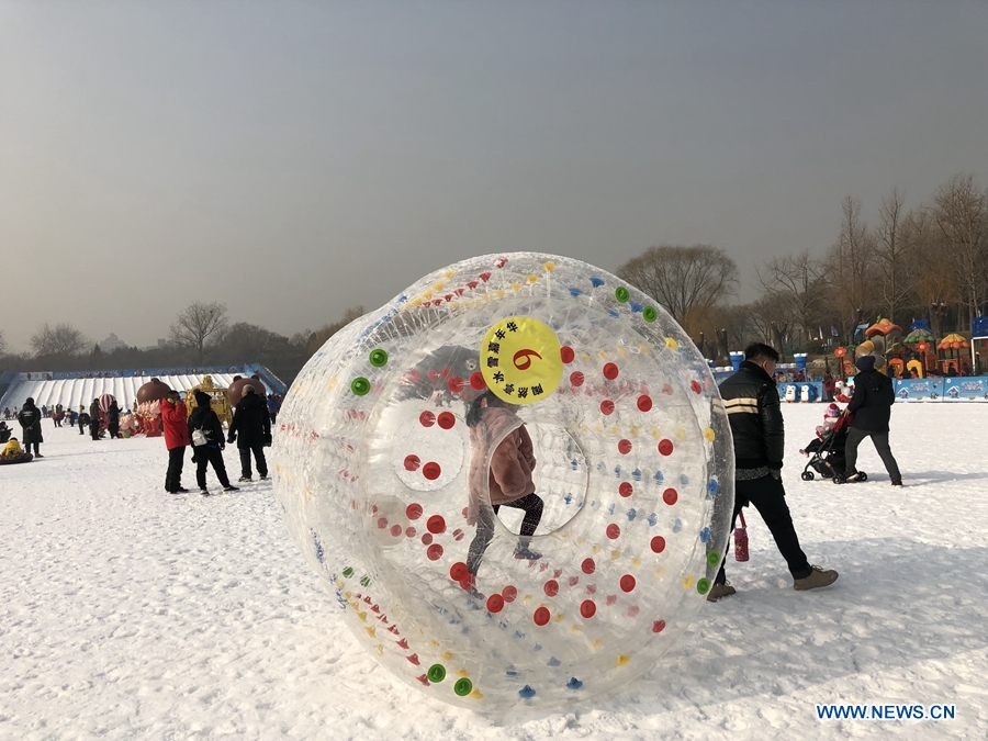 People have fun in outdoor snow area at Taoranting Park in Beijing, capital of China, Jan. 15, 2019. Outdoor ice rinks have opened to public as temperature drops in Beijing. (Xinhuanet/Hu Liangyu)