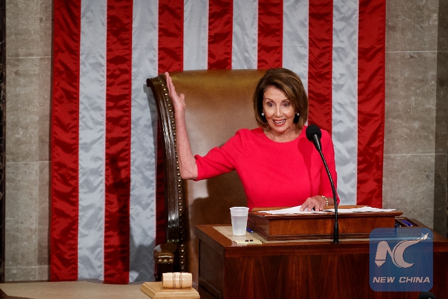 Nancy Pelosi speaks after being elected the new speaker of the U.S. House of Representatives on Capitol Hill in Washington D.C., the United States, on Jan. 3, 2019. (Xinhua/Ting Shen)