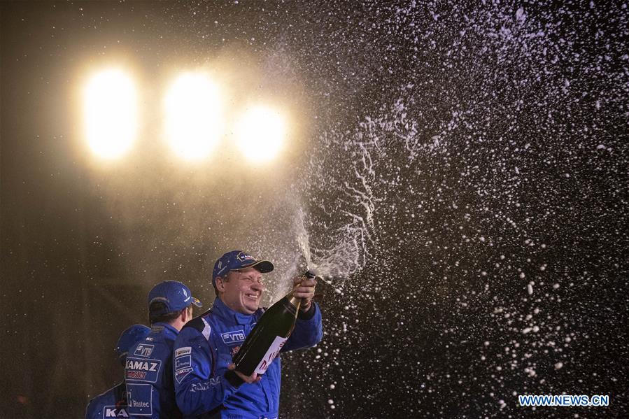 Russian Vladimir Rybakov, mechanic of Russian driver Eduard Nikolaev celebrates during the awarding ceremony of the 2019 Dakar Rally Race, in Lima, Peru, on Jan. 17, 2019. Eduard Nikolaev claimed the title of the truck class with 41 hours 01 minute and 35 seconds. (Xinhua/Li Ming) (Xinhua/Li Ming)