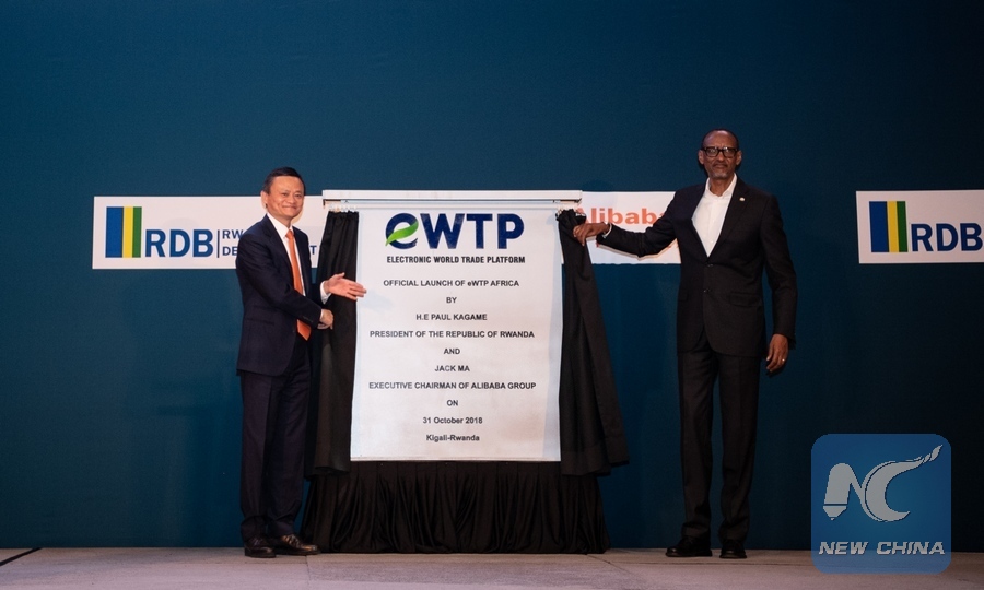 Jack Ma (L), Executive Chairman of Alibaba Group, and Rwandan President Paul Kagame jointly unveil the plaque of Alibaba's Electronic World Trade Platform (eWTP) at the eWTP launching ceremony in Kigali, Rwanda, Oct. 31, 2018. China's e-commerce giant Alibaba and the government of Rwanda on Wednesday launched Alibaba's Electronic World Trade Platform (eWTP), which makes Rwanda the first African country that launches this platform. (Xinhua/Li Yan)