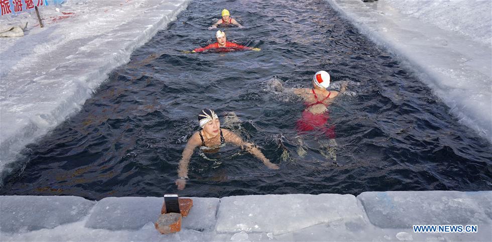 Members of North Polar Bear Winter Swimming Club swim in the Ganhe River in Jagdaqi of northeastern China's Heilongjiang Province, Jan. 22, 2019. Jagdaqi, located in northwest of Heilongjiang Province and east part of the Great Khingan Mountains, experiences cold weather in winter. The local North Polar Bear Winter Swimming Club, established in the year of 1998, keeps training every winter regardless of the low temperature. There are 92 members in the club at present and 15 of them are women winter-simmer lovers. (Xinhua/Cai Yang)