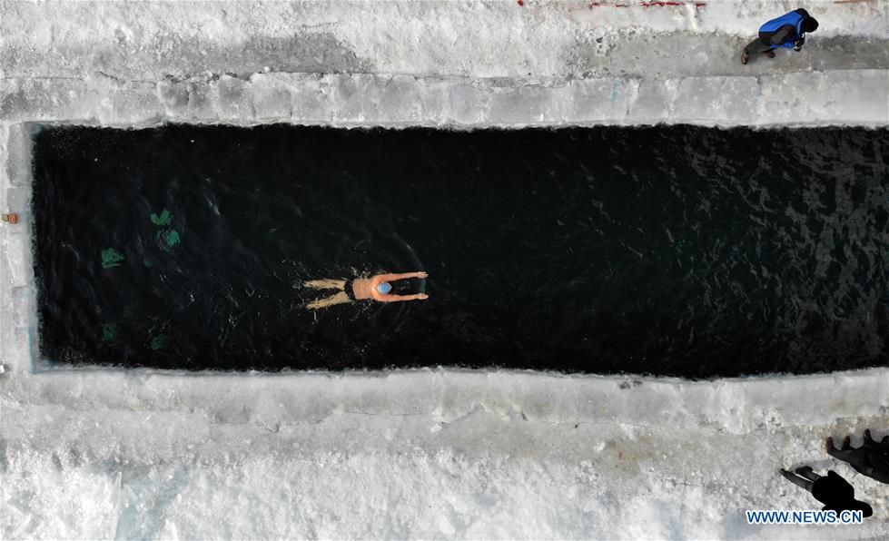 A memeber of North Polar Bear Winter Swimming Club swims in the Ganhe River in Jagdaqi of northeastern China's Heilongjiang Province, Jan. 22, 2019. Jagdaqi, located in northwest of Heilongjiang Province and east part of the Great Khingan Mountains, experiences cold weather in winter. The local North Polar Bear Winter Swimming Club, established in the year of 1998, keeps training every winter regardless of the low temperature. There are 92 members in the club at present and 15 of them are women winter-simmer lovers. (Xinhua/Cai Yang)