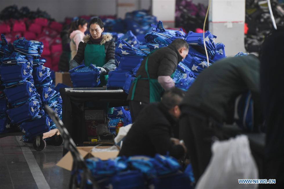 Workers process bags for Israeli market at a bag and luggage company in Fuqing City, southeast China's Fujian Province, Jan. 25, 2019. Production has been in full swing at Xiangxing Group here to meet foreign market demand before the coming Spring Festival holidays. (Xinhua/Song Weiwei)