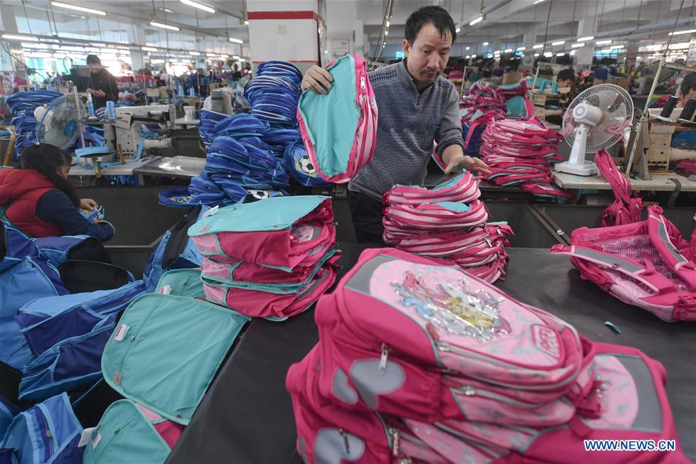 Workers process bags for Israeli market at a bag and luggage company in Fuqing City, southeast China's Fujian Province, Jan. 25, 2019. Production has been in full swing at Xiangxing Group here to meet foreign market demand before the coming Spring Festival holidays. (Xinhua/Song Weiwei)