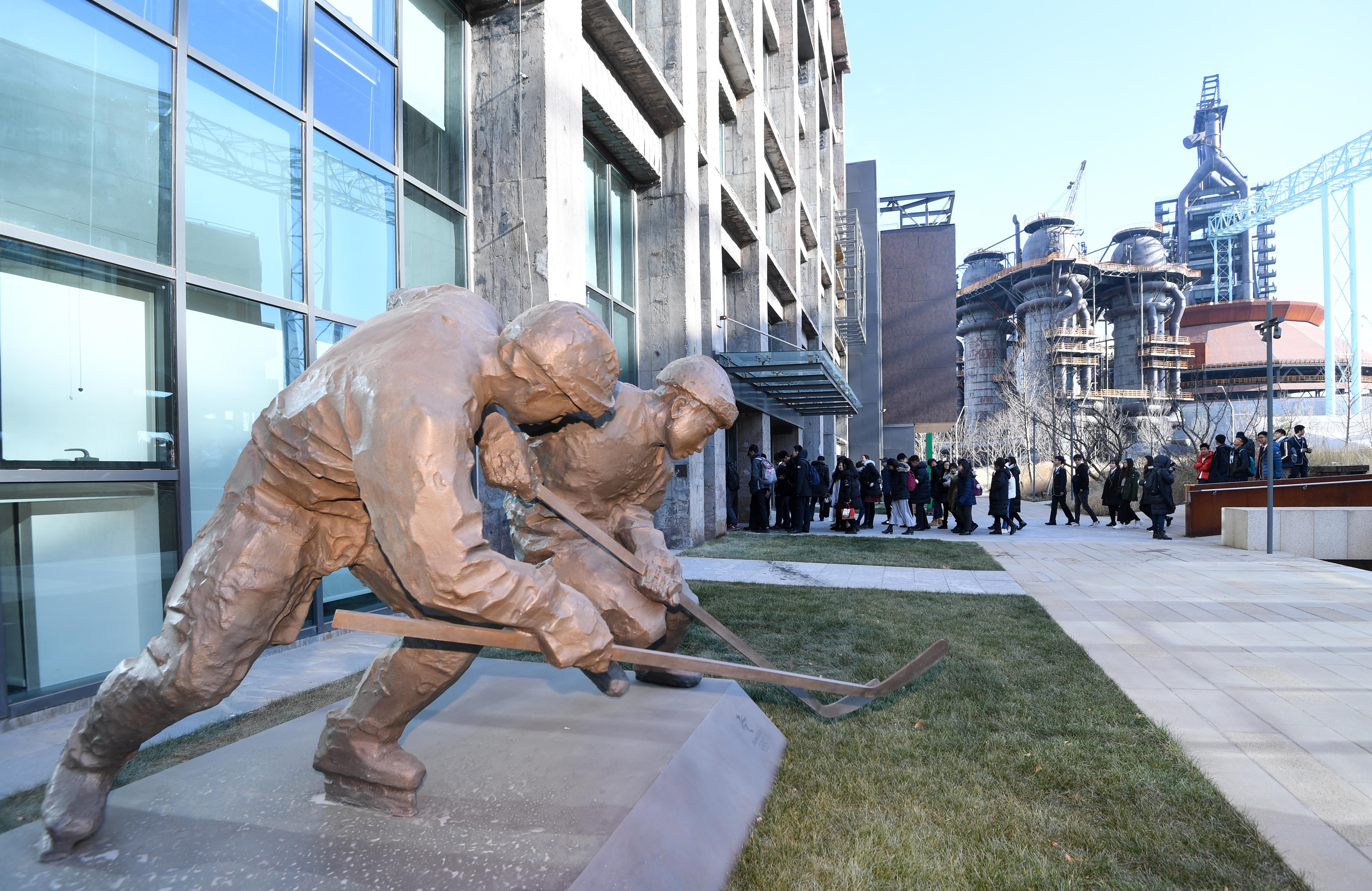 Photo taken on Jan. 22. 2019 shows a statue of ice hockey at the headquarters of Beijing 2022 Olympic Games Organizing Committee in Shougang Industrial Park, Beijing. (Xinhua/Chen Yehua)