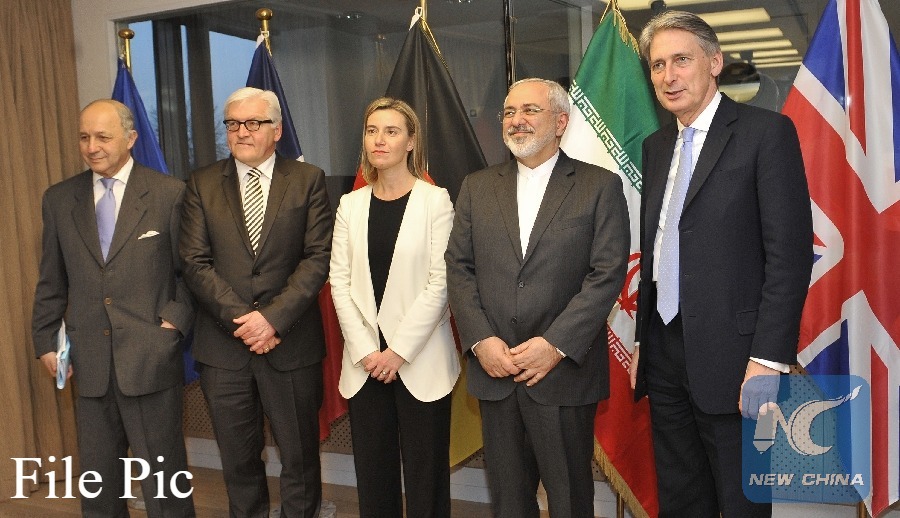 France's Foreign Minister Laurent Fabius, Germany's Foreign Minister Frank Walter Steinmeier, EU High Representative for Foreign Affairs and Security Policy Federica Mogherini, Iran's Foreign Minister Mohammad Javad Zarif and British Foreign Secretary Philip Hammond (from L to R) pose for photos during a meeting of Iran nuclear negotiations in Brussels, Beglium, on March 16, 2015. (Xinhua File photo)