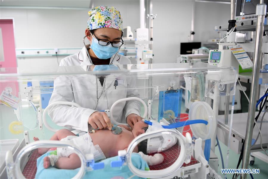 A nurse checks the physical condition of a baby at an intensive care unit in a care center for mothers and children in Suixian County, central China's Henan Province, Feb. 4, 2019. People from various industries stick to their posts on the eve of the Spring Festival which falls on Feb. 5 this year. (Xinhua/Liu Junxi)