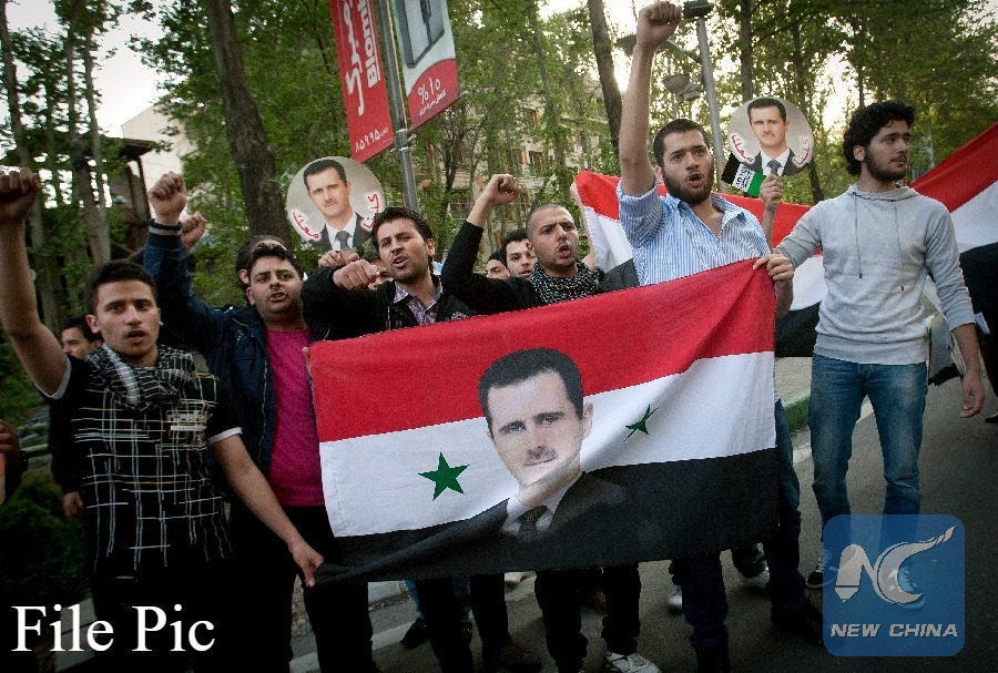 Syrian Students studying in Iran shout slogans during a rally in support of Syrian President Bashar al-Assad in front of the UN office in Tehran, capital of Iran, on April 23, 2012. (Xinhua File photo)