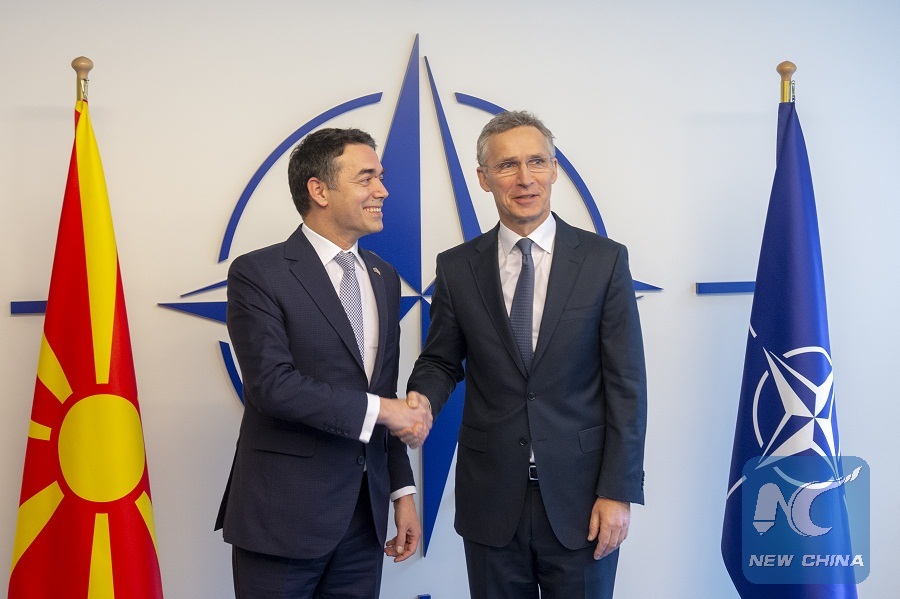 Macedonian Foreign Minister Nikola Dimitrov (L) meets with NATO Secretary General Jens Stoltenberg at the alliance's headquarters in Brussels, Belgium, Feb. 6, 2019. (Xinhua/NATO)