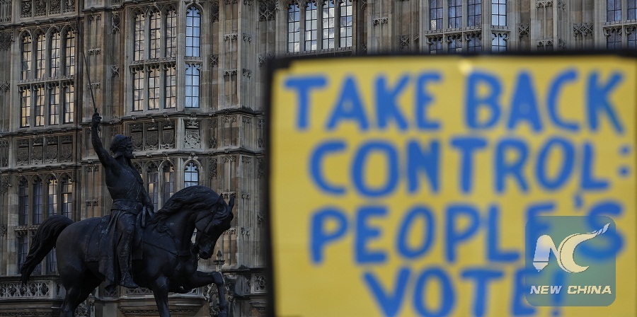 Photo taken on Jan. 22, 2019 shows the statue of Richard I and a placard outside the Houses of Parliament in London, Britain. (Xinhua/Han Yan)