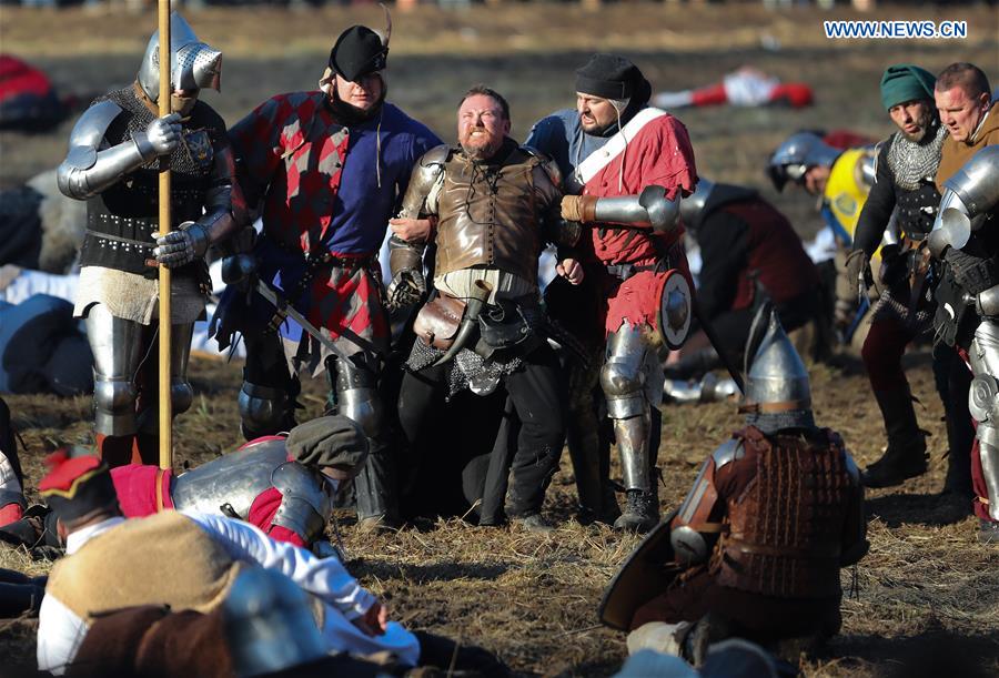 People re-enact an ancient battle of peasant uprising which took place in 1573, in Donja Stubica, Croatia, on Feb. 9, 2019. (Xinhua/Jurica Galoic)