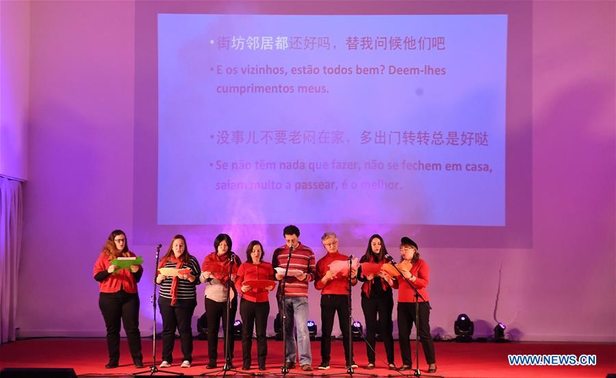 Students of University of Lisbon perform at the New Year's celebrating event in Lisbon, Portugal, Feb. 13, 2019. A Chinese New Year celebrating event and an exhibition on the intangible cultural heritage of China's Tianjin City were held in the Confucius Institute of University of Lisbon on Wednesday. (Xinhua/Zhang Liyun)