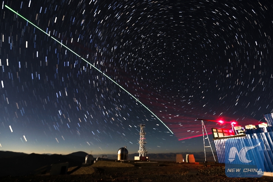 Composite photo taken on Dec. 9, 2016 shows a satellite-to-earth link established between quantum satellite "Micius" and the quantum teleportation experiment platform in Ali, southwest China's Tibet Autonomous Region. (Xinhua/Jin Liwang)