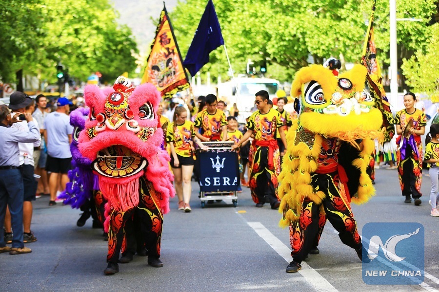 Members of the Chinese community perform lion dance during a parade of the 23rd National Multicultural Festival in Canberra, Australia, on Feb. 16, 2019. (Xinhua/Pan Xiangyue)