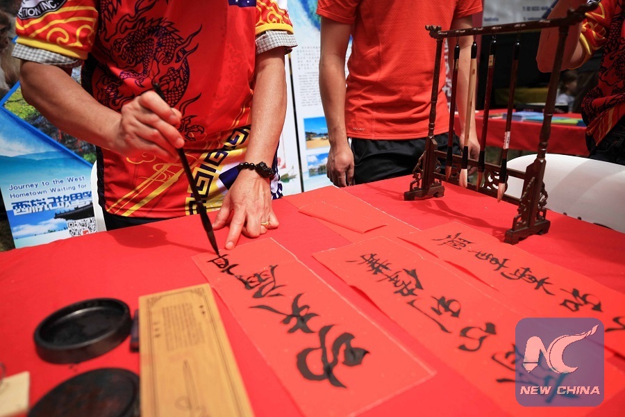 A Chinese calligraphy artist writes at the 2019 National Multicultural Festival in Canberra, Australia, Feb. 16, 2019. (Xinhua/Pan Xiangyue)