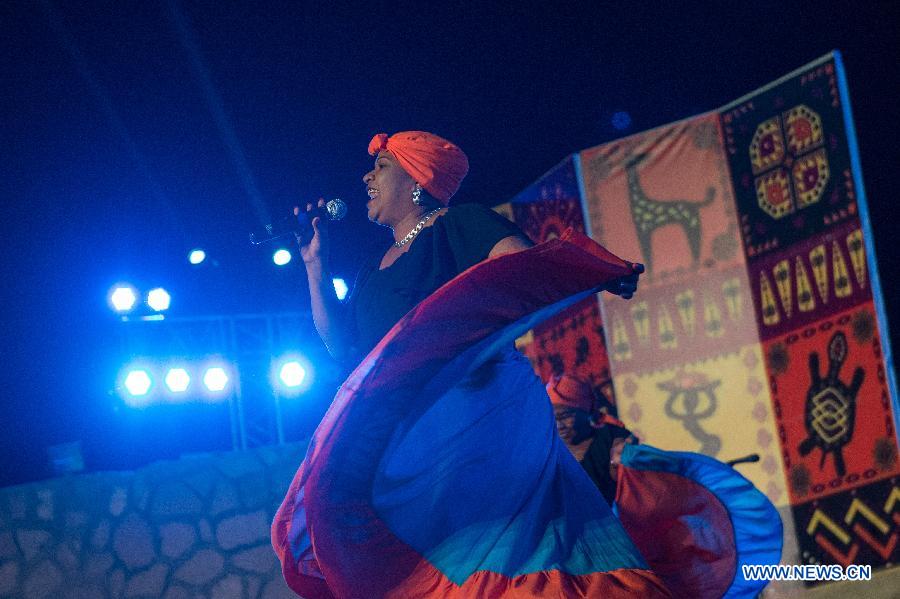 A Mauritian artist performs singing and dancing at the opening ceremony of the 7th Aswan International Festival of Culture and Arts in Aswan, Egypt, Feb. 17, 2019. The 7th Aswan International Festival of Culture and Arts kicked off here on Sunday with the participation of folk and traditional bands from 13 African, Asian and European countries. (Xinhua/Meng Tao)