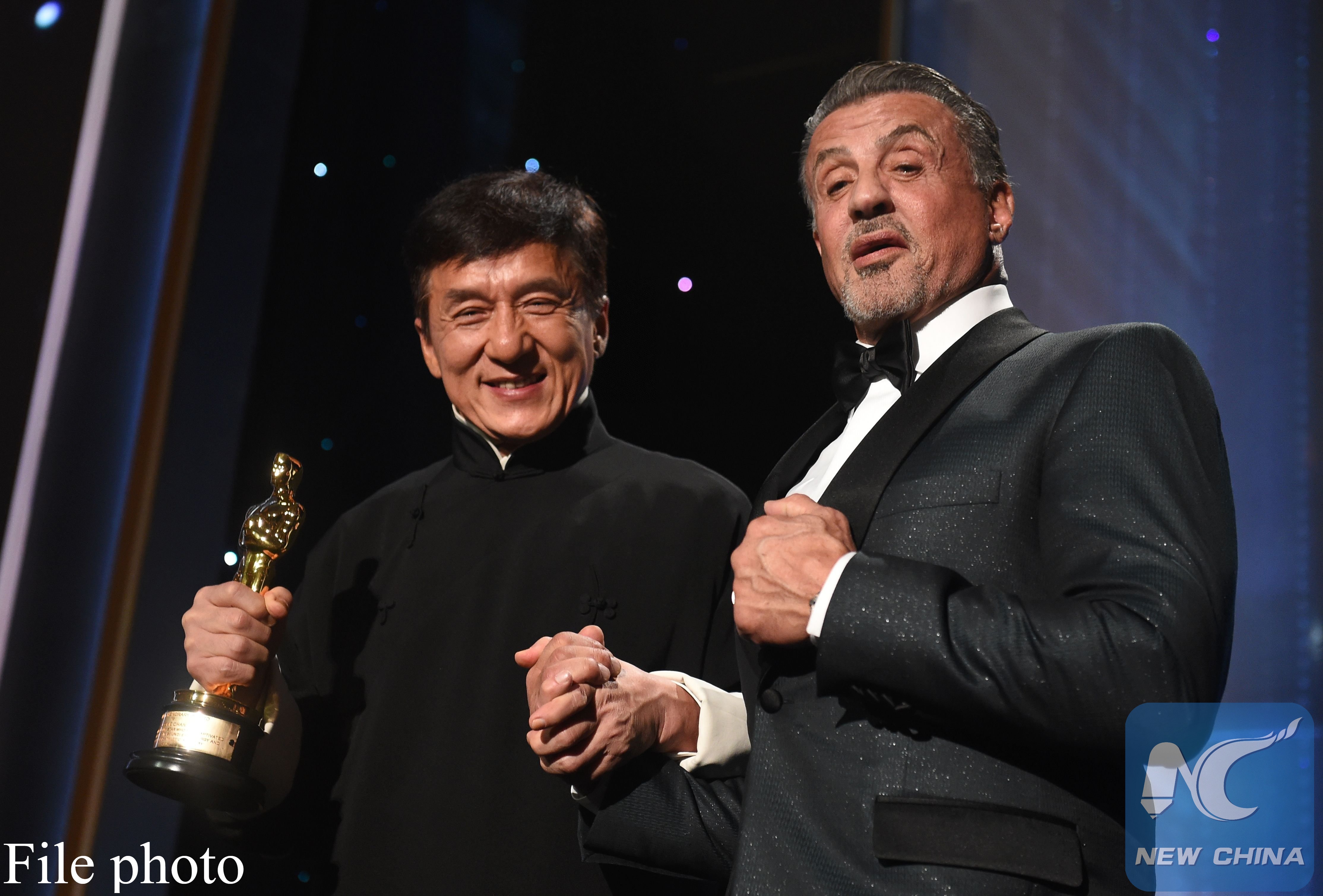 Jackie Chan (L) poses with actor Sylvester Stallone after Chan accepted his Honorary Oscar Award during the 8th Annual Governors Awards hosted by the Academy of Motion Picture Arts and Sciences at the Hollywood & Highland Center in Hollywood, California on Nov. 12, 2016.