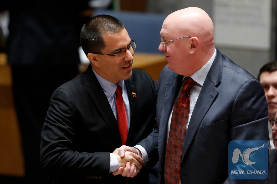 File Photo: Vassily Nebenzia (R), Russian permanent representative to the United Nations, shakes hands with Venezuelan Foreign Minister Jorge Arreaza during a Security Council emergency meeting on the situation in Venezuela, at the UN headquarters in New York, Jan. 26, 2019. (Xinhua/Li Muzi)