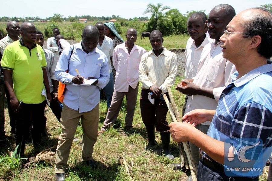 File photo shows a Chinese cereals expert explains to farmers in the eastern Ugandan district of Budaka how to grow Chinese hybrid rice, Oct. 25, 2016. (Xinhua/Ronald Ssekandi)