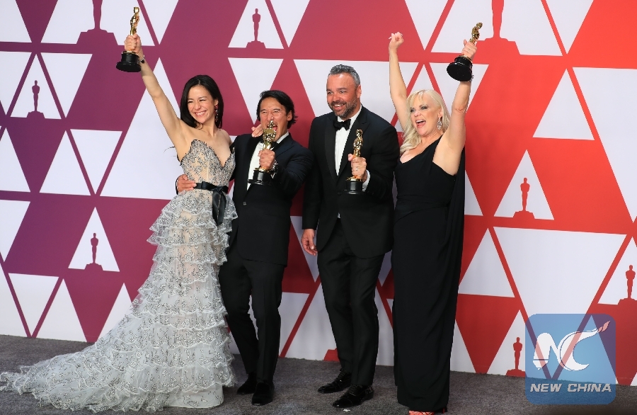 "Free Solo" directors Elizabeth Chai Vasarhelyi (L1) and Jimmy Chin (L2), both of whom are of Chinese origin, pose with the Best Documentary Feature award during the 91st Academy Awards ceremony, or the Oscars, at the Dolby Theatre in Los Angeles, the United States on Feb. 24, 2019. (Xinhua/Li Ying)