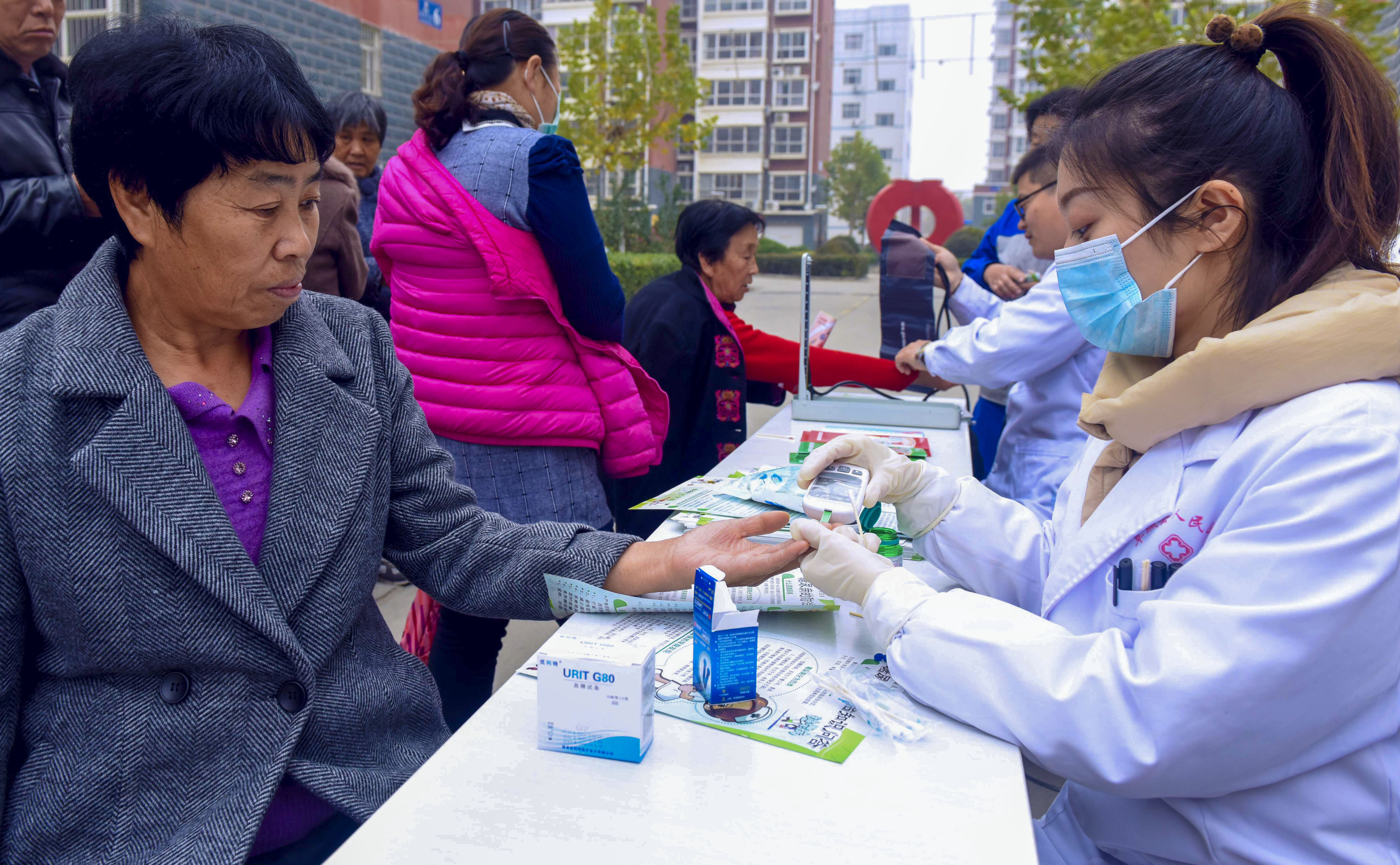 A medical staff member checks the blood glucose for a citizen during a free clinic service in Fucheng County, Hebei Province , Nov. 14, 2018.(Xinhua)
