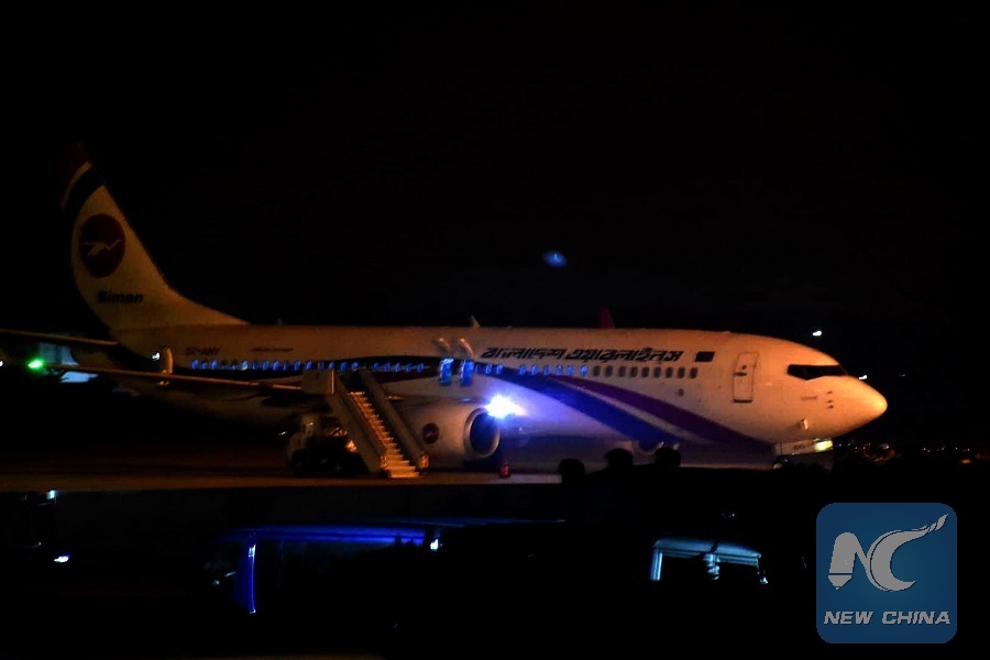 Photo taken on Feb. 24, 2019 shows a passenger plane of the Biman BangladeshAirlines that made an emergency landing after a hijack attempt at the Shah Amanat International Airport in Chattogram, Bangladesh. (Xinhua/Stringer)