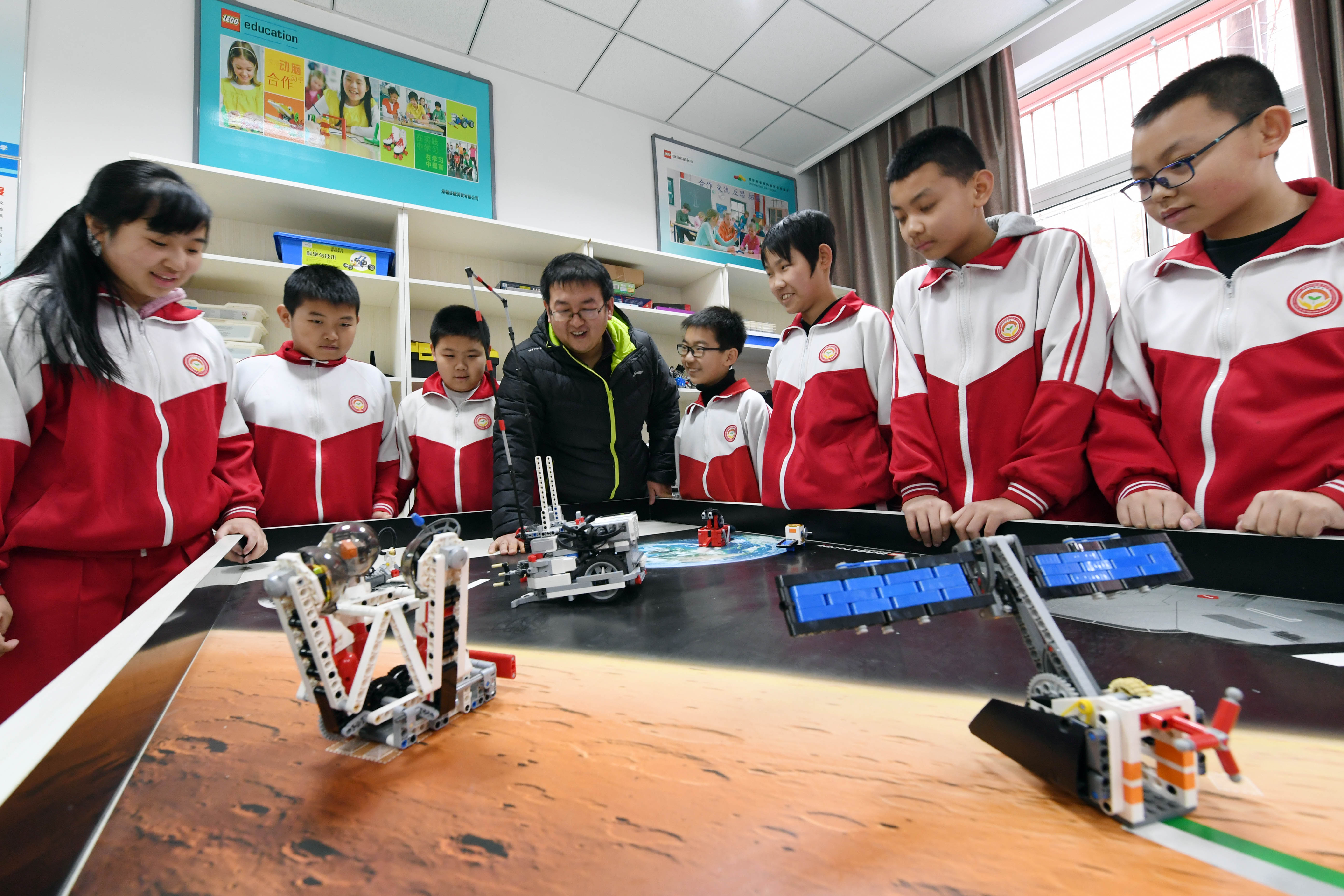 Students manipulate robots under the guidance of a teacher at Nanyingzi Primary School in Chengde, north China's Hebei Province, Dec. 20, 2018. (Xinhua/Niu Xiaolei)