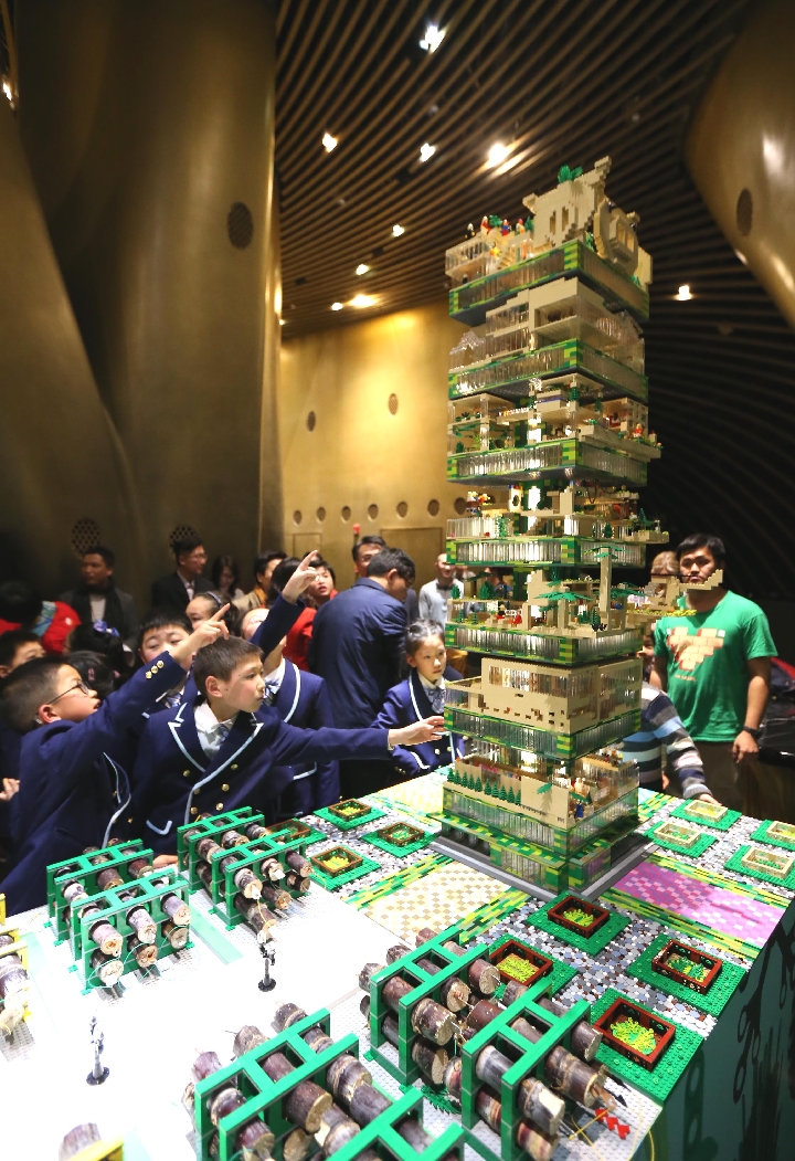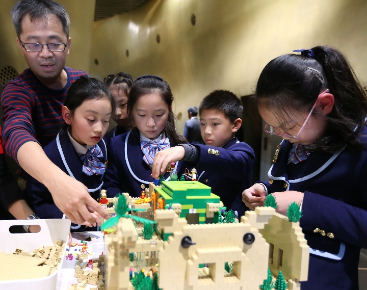 Children creating the "Vertical City" model under the guidance of a Lego Certified Professional at Shanghai Tower, in Shanghai, on Feb. 27, 2019. (Xinhua/Ren Long)