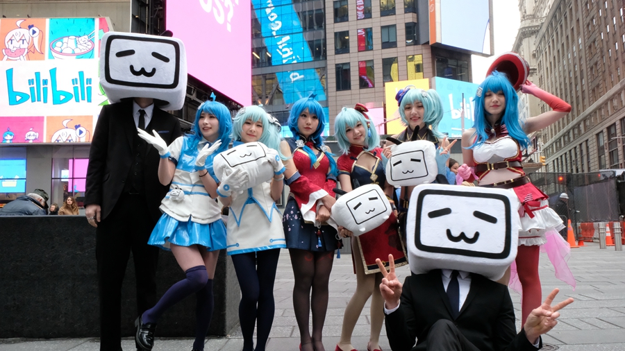 Cosers from Bilibili, a Chinese online platform for animated video, pose for photos at Times Square in New York, the United States, on March 28, 2018. Bilibili Inc., a Chinese online platform for animated video, rang the Nasdaq Stock Market opening bell in celebration of its initial public offering (IPO) on the day. (Xinhua)