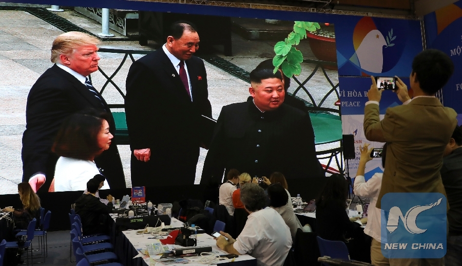 Reporters watch a TV live broadcast about talks between top leader of the Democratic People's Republic of Korea (DPRK) Kim Jong Un and U.S. President Donald Trump in Hanoi, Vietnam, Feb. 28, 2019. (Xinhua/Wu Xiaochu)