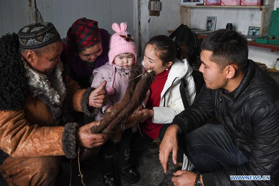 Photo taken on Dec. 20, 2018 shows Silanbek Sahshi (1st L) passing a pair of small fur snowboards to his granddaughter in Altay, northwest China's Xinjiang Uygur Autonomous Region. Silanbek Sahshi, a 65-year-old man of Kazak ethnic group, is an inheritor of traditional fur-snowboard-making in Xinjiang. As the fourth-generation inheritor of his family's craft, Silanbek has been engaged in the handicraft for almost 50 years.The fur snowboards are made of pine or birch wood and covered with horsehide. The horsehide can provide friction when skiers go uphill, as the graining of the horsehide provides friction to help to climb mountains, while also helping to slide down the mountain smoothly. It takes Silanbek about half a month to make one pair of snowboards by hand. At present, he is imparting his skills to his son Huanshbek Silanbek. An ancient rock painting that depicted people hunting with skis, dating back more than 12,000 years, was found in Altay Prefecture. This discovery has provided solid evidence of the area's long tradition and culture of skiing. By now, three ski fields have been built in Altay, where the snow season lasts for more than half a year, attracting tourists from home and abroad. The fur snowboards, which have evolved from the travel tools for hunting into sports equipments, enriched the winter tourism projects. The vigorous development of winter sports has brought the ancient craftmanship "back to life". (Xinhua/Sadat)